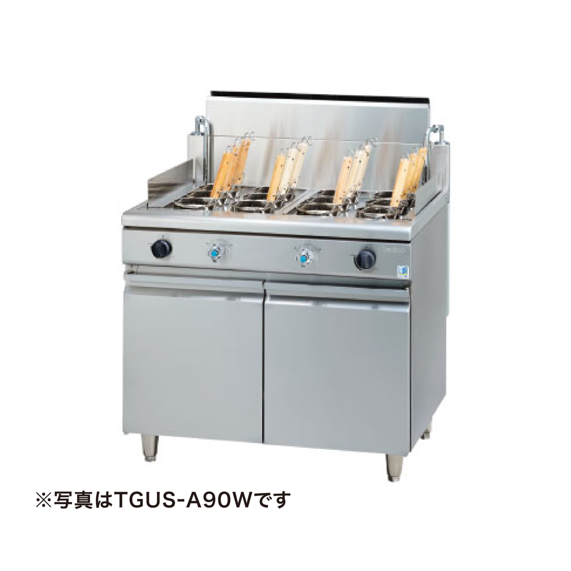 ※画像はイメージです その他 タニコー/TGUS-A90AW/角型ゆで麺器(省エネタイプ) ¥994,000 ¥637,000(税別) ( 税込¥700,700 ) 数量 〈製品詳細〉 ・角型ゆで麺器(省エネタイプ) ・メーカー:タニコー ・型式:TGUS-A90AW ・外寸寸法:900×750×850 ・ガス消費量:都市ガス27.9kW/LPガス27.9kW ・ガス接続口径A(都市/LP):15×2 ・給水口径A:15 ・排水口径A:32×2 〈仕様・備考〉 ■高さ850mm ■二槽式・12テボ