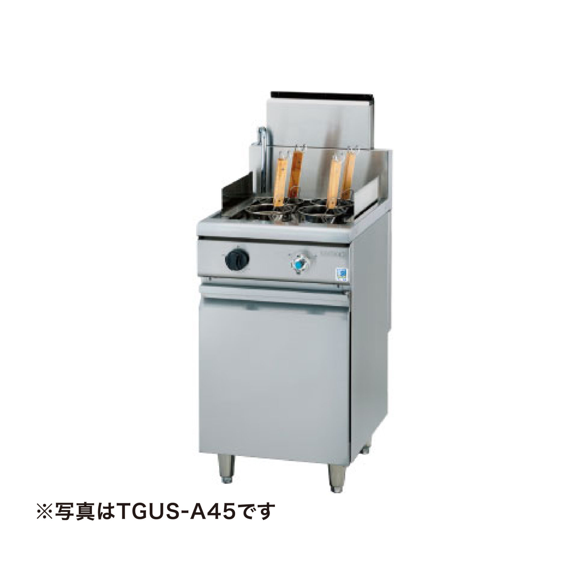 ※画像はイメージです その他 タニコー/TGUS-A45AL/角型ゆで麺器(省エネタイプ)オートリフトタイプ ¥1,100,000 ¥702,000(税別) ( 税込¥772,200 ) 数量 〈製品詳細〉 ・角型ゆで麺器(省エネタイプ)オートリフトタイプ ・メーカー:タニコー ・型式:TGUS-A45AL ・外寸寸法:590×750×850 ・ガス消費量:都市ガス13.9kW/LPガス13.9kW ・ガス接続口径A(都市/LP):15 ・電源:1φ100V ・消費電力:0.2kW×2 ・給水口径A:15 ・排水口径A:32 〈仕様・備考〉 ■高さ850mm ■一槽式・6テボ