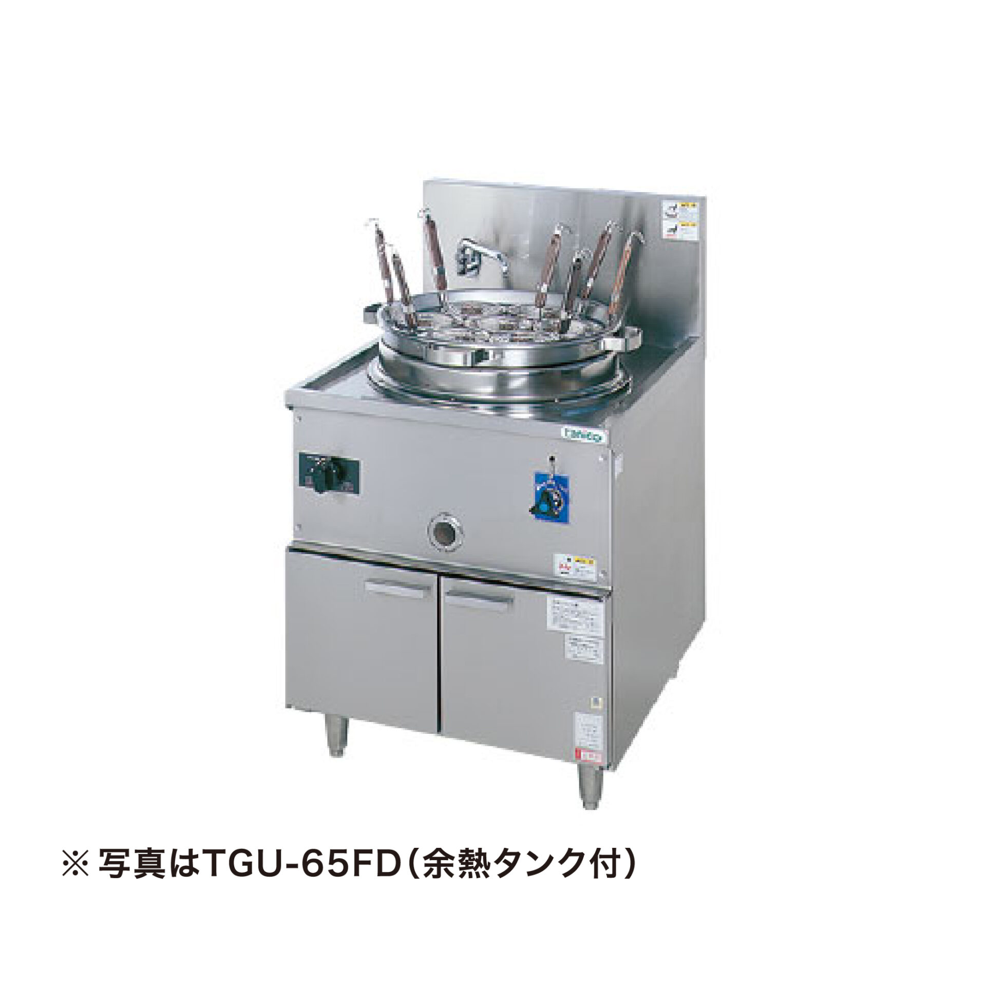 ※画像はイメージです その他 タニコー/TGU-65FD/ガスゆで麵器【ガス式】/奥行750mm ¥471,000 ¥313,000(税別) ( 税込¥344,300 ) 数量 〈製品詳細〉 ・ガスゆで麵器【ガス式】 ・メーカー:タニコー ・型式:TGU-65FD ・外寸寸法:650×750×800 ・ガス消費量:都市ガス20.9kW/LPガス19.2kW ・ガス接続口径A(都市/LP):20 ・給水口径A:15 ・排水口径A:40 ・鍋容量(ℓ):16 〈仕様・備考〉 ■高さ800mm ■7テボ